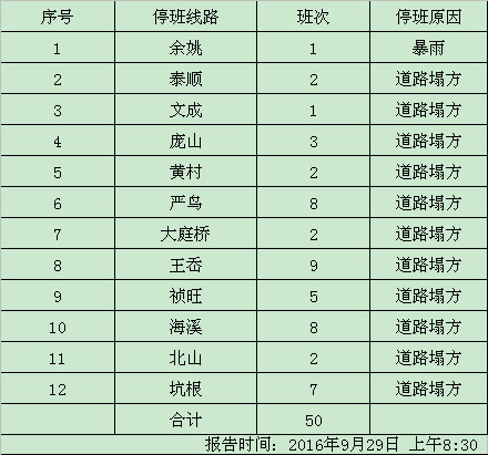 受臺風“鲇魚”影響,部分地方暴雨、道路塌方,為保護乘客的生命財產安全,9月29日,麗水客運東停開50個班次,詳見下表: