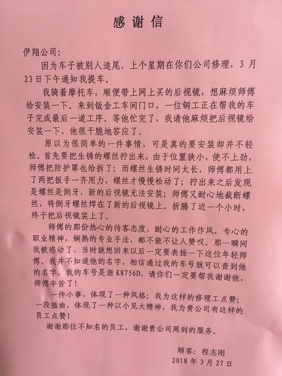 3月27日,伊翔公司總經理室收到一位客戶的感謝信,感謝公司售后服務部鈑金組員工鐘文軍師傅的熱心幫忙和周到服務。