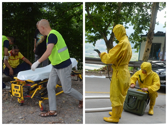 120趕到救治傷員、環保監測人員進行現場監測