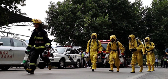 演練模擬一輛大客車在危險品運輸罐車事故路段受阻,面對危險品泄漏爆炸危險,道路運輸工作人員立即組織乘客撤離危險區域,及時上報險情并采取安全處置措施,等待交警、消防員、醫護和環保測評等人員趕赴現場處理的過程。短短10多分鐘,20個場景的演練科目流程一氣呵成。演練場景驚險逼真,扣人心弦,贏得了在場觀演人員和群眾的一致好評。