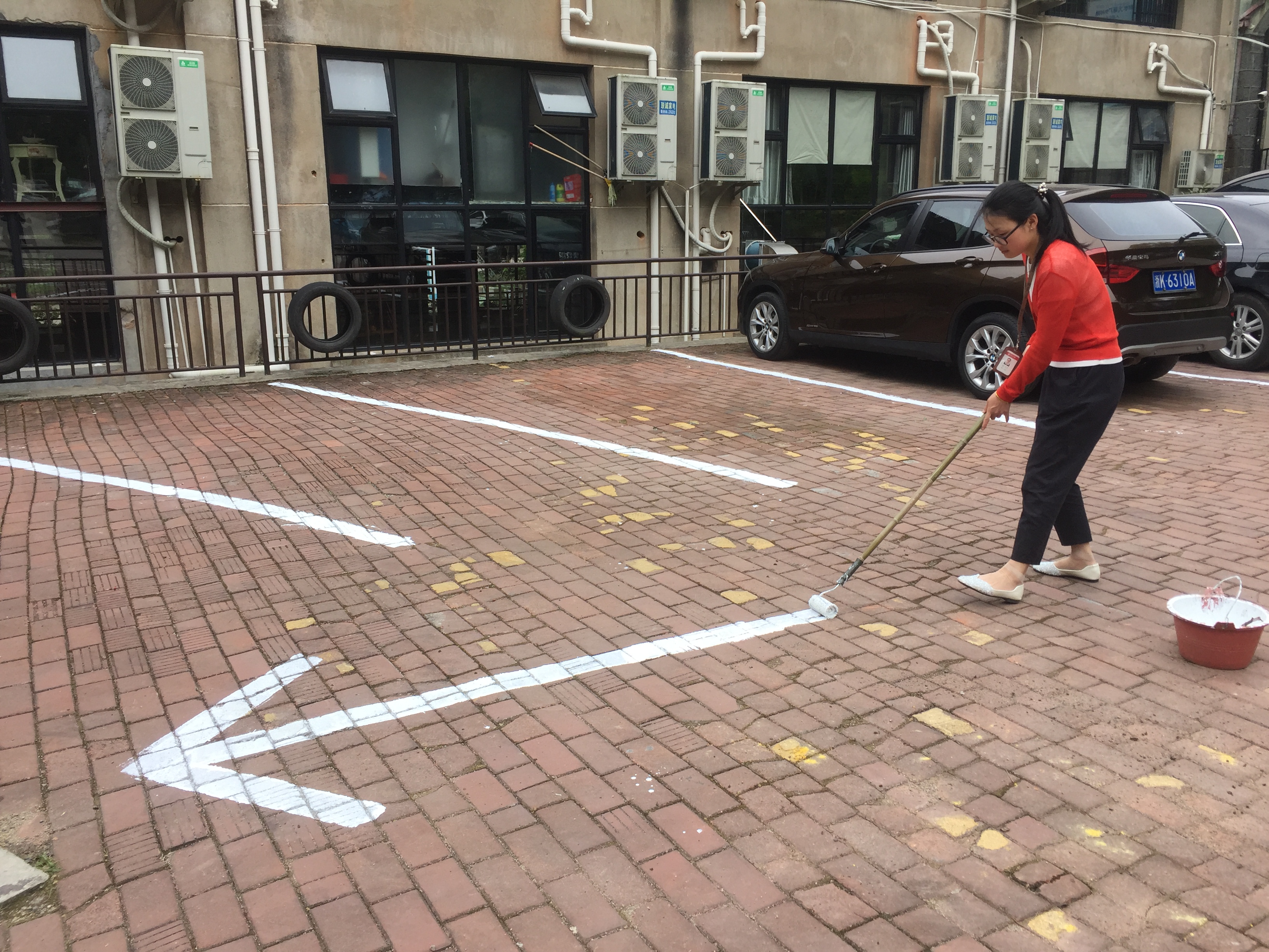 為了解決大修廠文化創意產業園區內亂停車問題,同時能節約成本,園區辦公室自行購置了油漆、膠水,對園區內停車場的停車位進行了重新劃線。并對通往停車場的各個路口、消防通道添加了警示標識,使園區內車輛的停放更加規范有序。