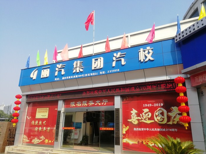 鮮艷的五星紅旗懸掛在汽校報名注冊中心大門頂端,四周插著五顏六色的旗幟,在藍天的映襯下顯得格外耀眼。大門兩側,兩排喜慶的紅燈籠隨風搖曳,烘托著祥和的節日氛圍。LED屏上,“熱烈慶祝中華人民共和國成立70周年”、“祝愿偉大的祖國永遠繁榮昌盛”的標語滾動播放,氣氛濃厚?!跋灿瓏鴳c”的巨大金色標語和汽?!皞魇诩妓?、傳承平安”核心價值的巨幅廣告相互輝映,相得益彰。