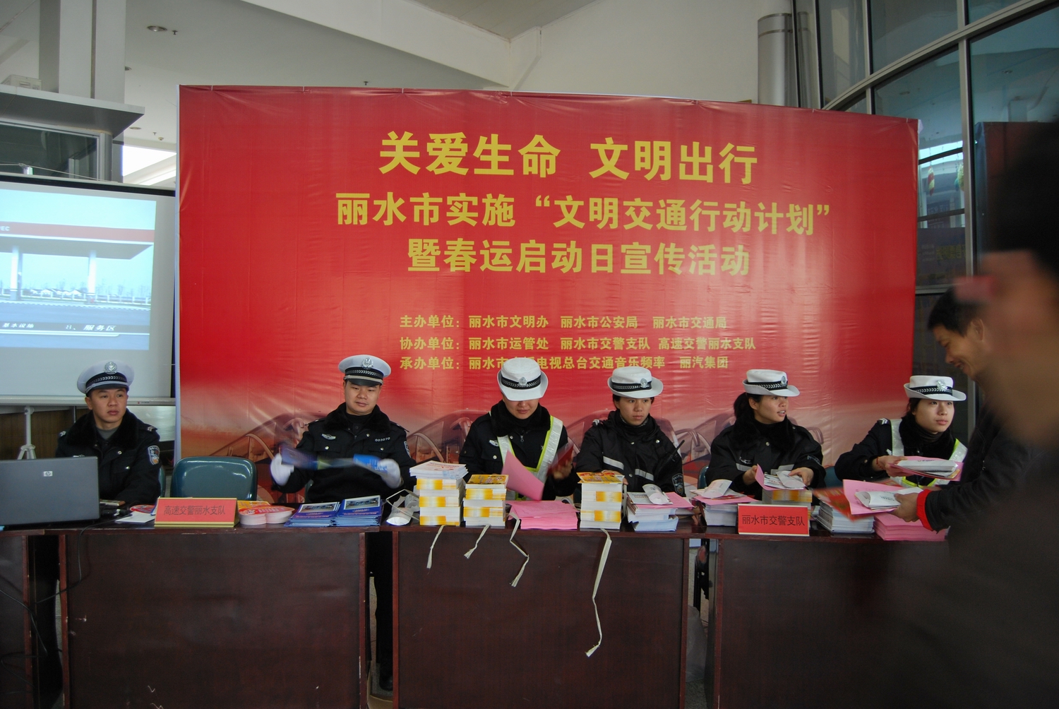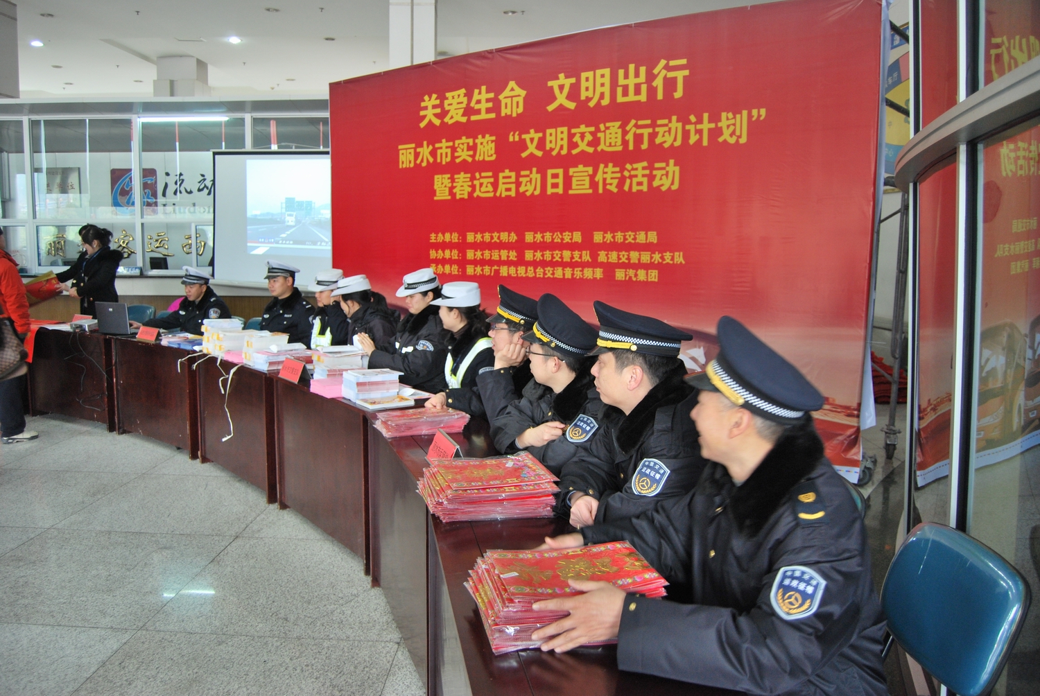 春運首日,由麗水市文明辦、麗水市公安局、麗水市交通局主辦,麗水市運管處、麗水市交警支隊、高速交警麗水支隊協辦,麗水電臺交通音樂頻率、麗汽集團承辦的 關愛生命 文明出行 麗水市實施“文明交通行動計劃”暨春運啟動日宣傳活動在麗水客運西站舉行。
