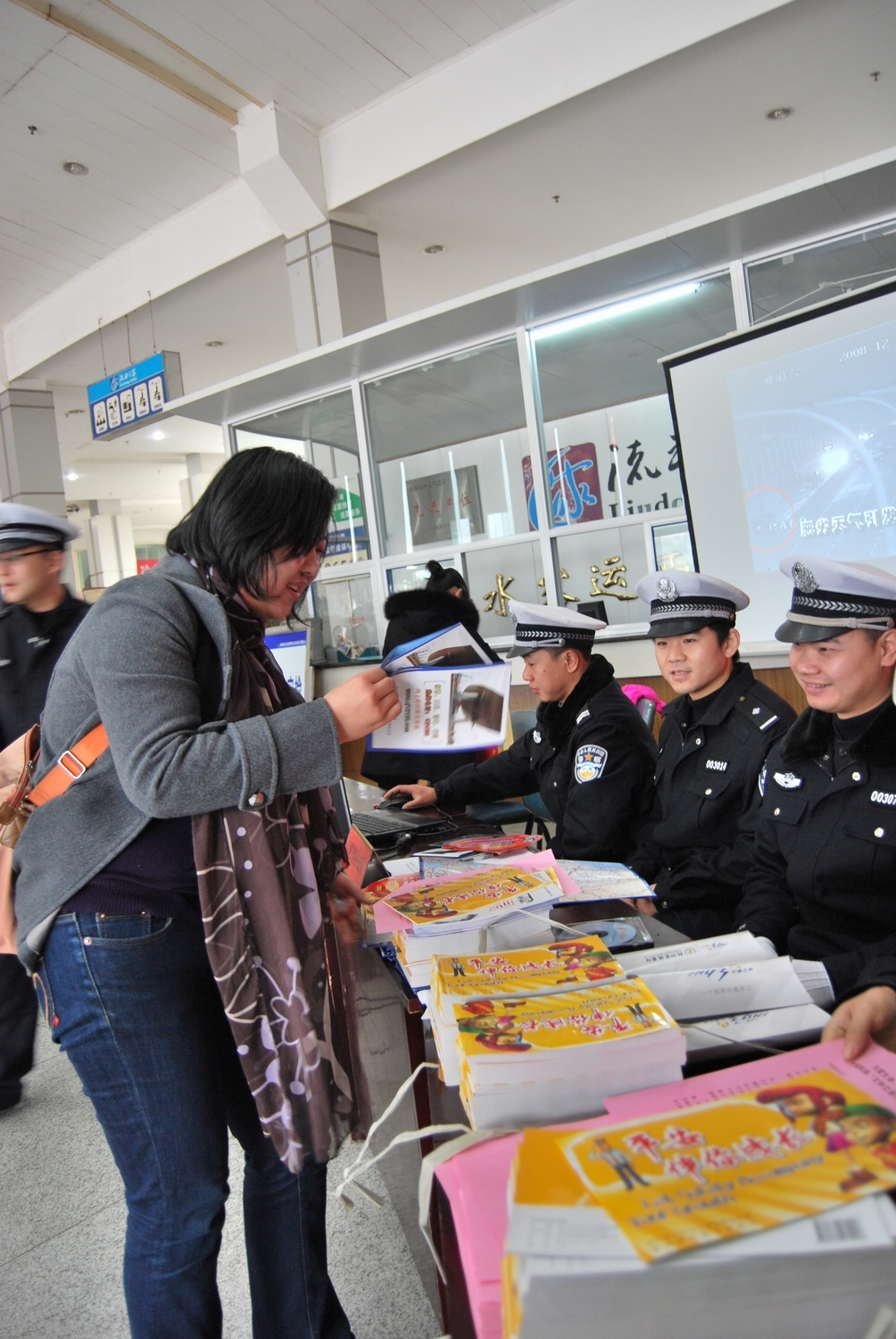 此次活動以“關愛生命、文明出行”為主題,交警部門準備了《平安伴你成長》、《道路交通事故警示錄》、《浙江省高速公路指南》等圖冊進行發放,市交警隊的同志特意將《關愛生命、文明出行--全國實施“文明交通行動計劃”倡議書》送到候車旅客手中,市運管處、交通音樂頻道、高速交警支隊還進行了春聯、“?!弊趾推桨卜F場贈送,向過往旅客送出新年祝福。