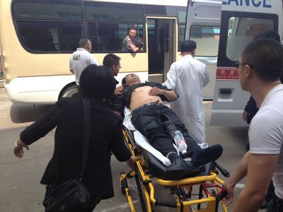 此時120急救車也趕到,通過醫生現場診斷確為中暑,大家就一起把病人抬上了急救車,由于大家的及時救助,為救治爭取了時間,否則后果很難想像。