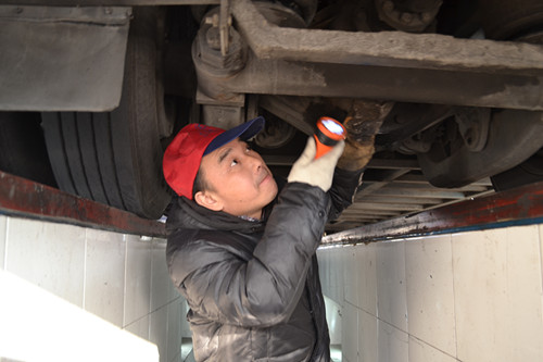 此時又一輛待檢車輛開入門檢線,何俏杰從兜里掏出一個手電筒,走入門檢地溝,用手電照看車輛底盤的情況?!稗D動軸正?!薄皞鲃虞S正?!薄皠x車正?!薄盁o漏油”,然后他又繞著車子“轉向燈”“防霧燈”“大燈”“雨刮器”…… 雖然只是些很小的細節,何俏杰都一一仔細的檢查,同時將結果告知駕駛員,接著他進入車廂內部,查看車內安全錘,滅火器是等安全設施配備情況。各項檢查正常,何俏杰拿出門檢單,嫻熟地在門檢單上填寫被檢車輛的車牌號、時間,然后簽字、蓋章。
