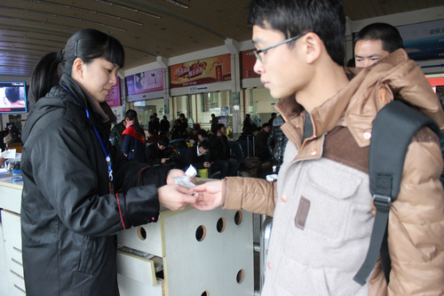 早已歸心似箭的旅客拎著大包小裹立刻在1號檢票口排起了長龍,趙妍不慌不忙的雙手接過旅客的車票看一眼票,然后刷票、撕下票根,一個、兩個、三個……一會兒的功夫,趙妍便完成了對幾十個旅客的檢票工作?!皬男睦砩蟻碚f,旅客等候檢票的時候都很著急,所以我們都會盡量檢得更快些?!壁w妍說,春運期間,最多時一天將近要檢近一千五六百張票,撕票根都撕到手酸。
