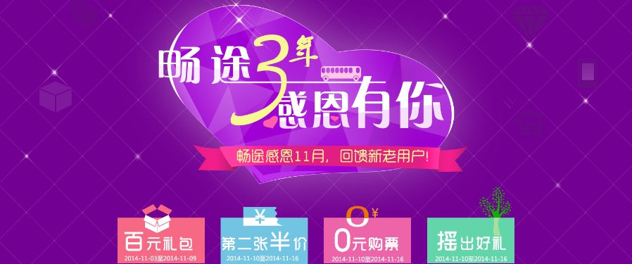 為了慶祝暢途網成立3周年,在11月份,暢途網推出了一整月的活動,有:11.3-11.9購票送百元禮包,11.10-11.16第二張票半價,11.17-11.23 0元購票,11.24-11.30搖錢樹送好禮?;顒佣喽?,優惠多多,讓大家在輕松享受購票的同時,帶給大家更多的實惠與樂趣!