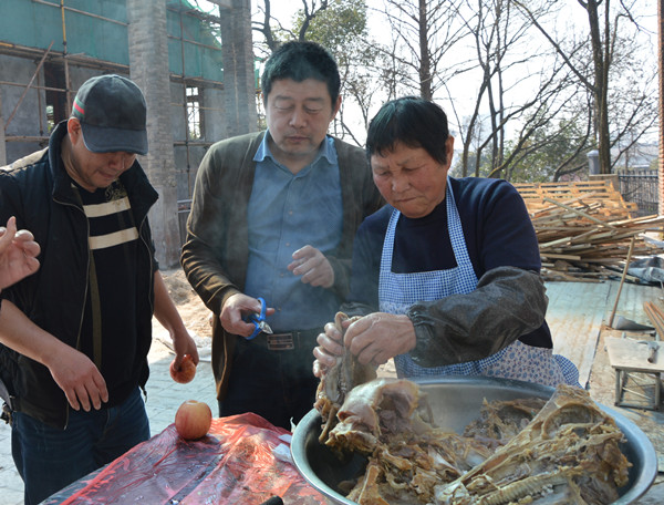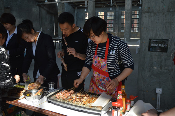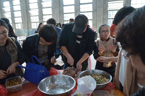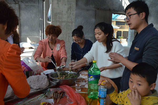 這邊包餃子的問題正討論的激烈,那邊熱氣騰騰的豬頭也出鍋了?!把?,這么大的豬頭,小時候過年的感覺”?!皩Π?,對啊,這種氣氛,這種味道,太有紀念意義了”?!皝韥韥?,我拍張照片,微信朋友圈曬一曬”。黃色餃子、綠色餃子、紅色餃子、紫色餃子相繼的出鍋了,燒烤的食品也相繼出爐,大家互相品評,因為都是自己動手參與,一切都變成了美食。
