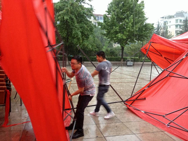 到傍晚16:50左右,正當我們順利支好遮陽棚,準備布置桌椅時,突然天空烏云密布,狂風咋起,隨即暴雨便瘋狂的肆虐了我們。原本支好的遮陽棚瞬間東倒西歪,有些甚至直接散架?!斑@可不得了,要耽誤明天的活動”,劉良群副經理立刻叫上大家沖出去“搶險”。雨水夾雜著汗水濕透了全身的衣服,他們沒有一句怨言。