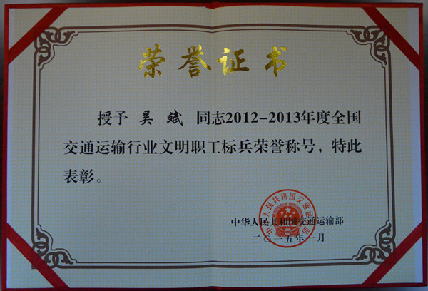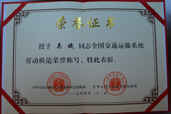 吳斌(左)榮獲全國交通運輸系統勞動模范、全國交通運輸行業文明職工標兵稱號