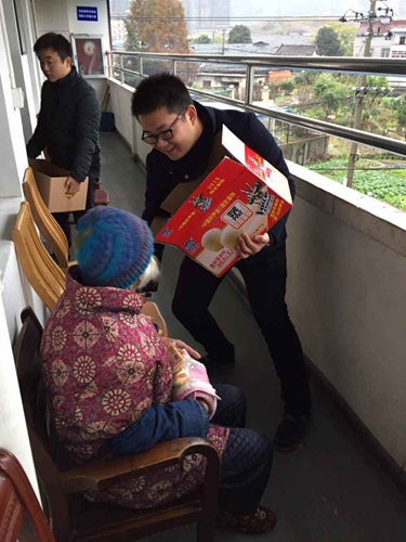 經過20多分鐘的車程,我們到達了靈山敬老院,那里很安靜祥和,大家都激動不已。因為事先聯系過,一下車,就有許多老人在門口等候我們了??粗覀儙淼囊幌湎涞乃秃脦状娘灨傻案鈺r,身旁的老人就一直沖著我們說:“你們太好了,還買這么多東西給我們,真是當不起的”。我們十余名團員迅速分工,有的將水果和餅干分箱裝袋,有的負責派送三樓的老人,有的負責派送二樓的老人,經過一個多小時的努力,我們終于全部派送完全部的物品。