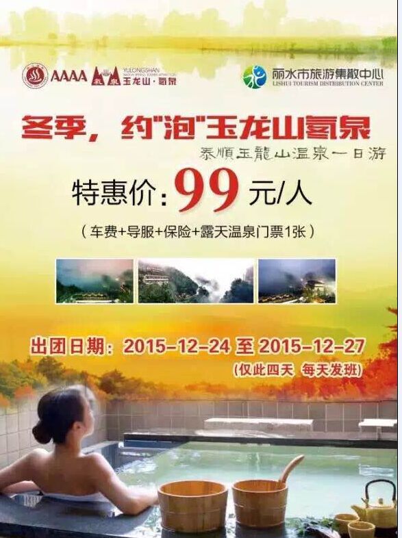 “溫州泰順玉龍山氡泉99元一日游”是集散中心即將在12月24-27日期間推出的一款特惠旅游產品,即在12月24日至27日期間,集散中心全天接受和發送前往溫州泰順玉龍山氡泉一日游,團費99元/人(包括車費、門票、導服費和保險費)。與平時的每人238元的團費相比,參加集散中心的特惠游,每人可以節省139元。