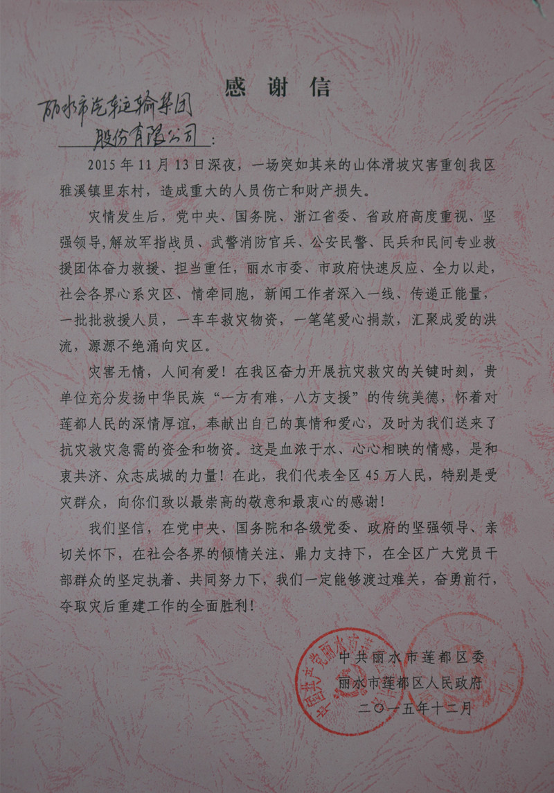 12月14日,集團公司收到蓮都區委區政府送來的感謝信,感謝集團公司在里東災區救援工作中的奉獻。