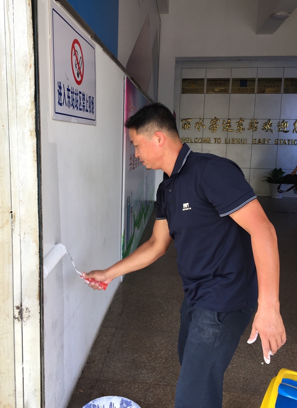 東站志愿者隊售票廳、候車廳、發車區墻壁進行刷白