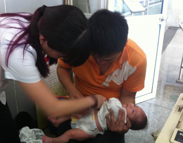 恰在這時,一名年輕的“奶爸”旅客左手拉著一個行李箱,背后背著一個大包,右手還抱著一個尚在襁褓中嚶嚶哭泣的小嬰兒,滿頭大汗的來到服務臺前,小寶寶可能肚子餓了,一直在哭泣,小寶寶的媽媽又沒有隨行,只有爸爸一個人對付小家伙,實在是沒轍了,只得到服務臺求助。